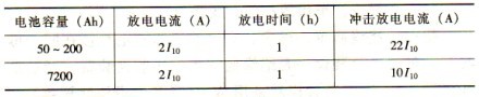 1)100%容量沖擊電流放電能力。當(dāng)蓄電池容量達(dá)到滿容量時,對容量為50~200Ah的電池用25I10沖擊電流值,容量大于200Ah的電池用20I10沖擊電流值,沖擊l0次,每次500ms的沖擊放電,每兩次放電時間問隔為2s,直流母線的電壓不得低于90%UN(UN為直流系統(tǒng)額定電壓)。
