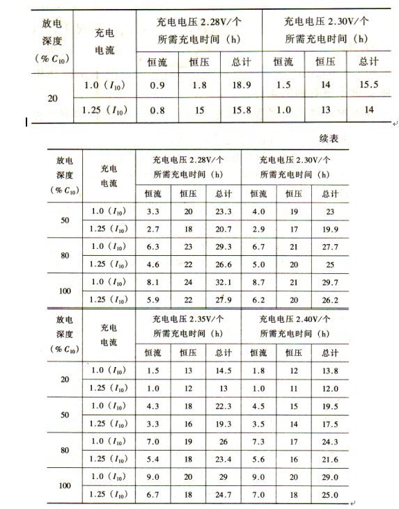初充電一浮充電一均衡充電是按下列程序循環(huán)進(jìn)行的。在投運(yùn)前,對電池進(jìn)行初充電,此時用恒流為l.Oll0進(jìn)行充電。當(dāng)單體電池電壓上升到2.35V轉(zhuǎn)為恒壓充電,此時充電流逐漸減少,然后轉(zhuǎn)為正常運(yùn)行狀態(tài)即浮充電壓為2.25V。當(dāng)運(yùn)行720h后,進(jìn)行均衡充電,即先以恒流l.Ollo電池充電,至電池電壓為2.35V轉(zhuǎn)為恒壓充電,電壓恒定一段時間又轉(zhuǎn)為正常浮充狀態(tài)。當(dāng)交流電源中斷后,此時自動 進(jìn)行均衡充電,以恒流l.Ol】o充電。電池電壓上升至2.35V后和上述運(yùn)行初充后均衡充電的過程相同。上述兩階段充電,其浮充轉(zhuǎn)均充的判斷大多采用時間來整定,即不論放電幅度如何,一日由恒流階段轉(zhuǎn)入恒壓階段后,延時若干個小時,則自動轉(zhuǎn)為浮充。實際情況是充電所需時間與放電幅度有關(guān),如圖3-1所示。因此事故放電的深度是隨機(jī)的,若用一個固定的時間來操作,則有可能造成電池的過充或欠充,所以采用蓄電池回路的充電電流作為均充終期的判據(jù)是較合理的。不同放電深度后充電的所需時間見表3-1。表3-1 不同放電深度后充電所需時間