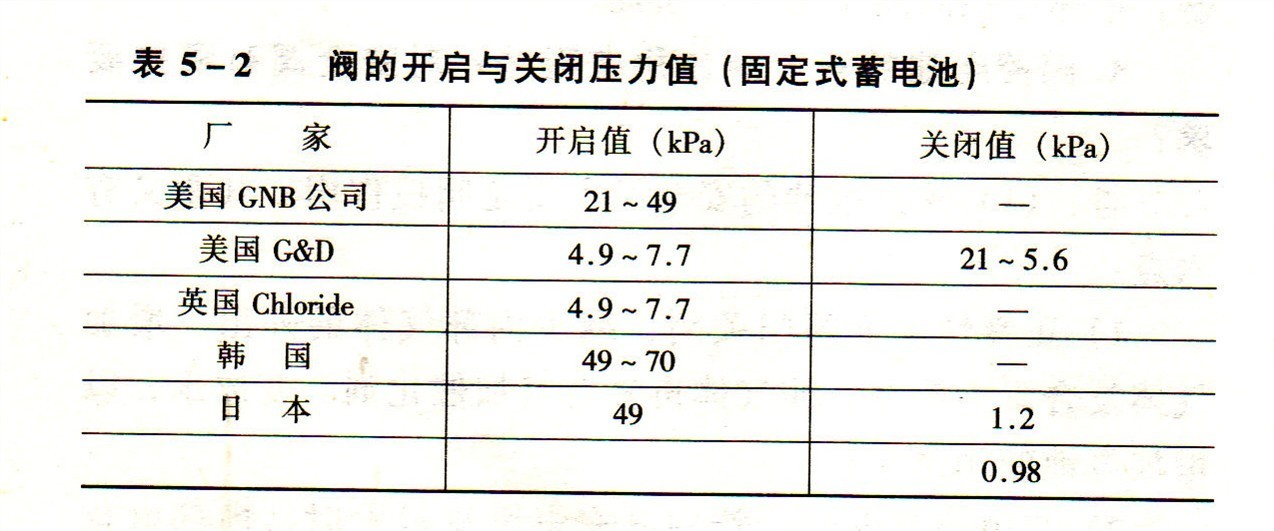 制造閥控式密封蓄電池的不同廠家,根據電池的性能、殼體材料和電池運行條件,設置不同的開啟壓力和關閉壓力?,F列出了幾家電池公司所設置的閥的開啟和關閉壓力值。