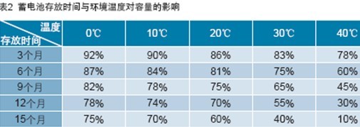 蓄電池在存放過程中存在自放電,如果長時間得不到補充,就會出現(xiàn)硫酸鹽化現(xiàn)象。這種現(xiàn)象如果沒有得到及時改善,蓄電池容量會降低甚至損壞不能使用。蓄電池在存貯過程中,環(huán)境溫度對容量影響也非常大,如表2所示。